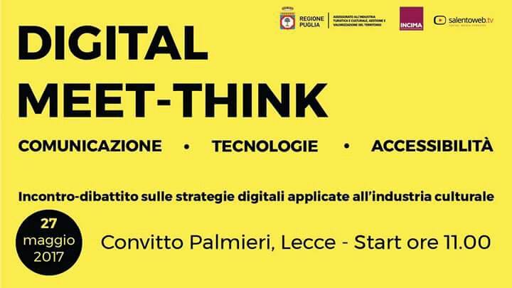 “DIGITAL MEET-THINK” è un progetto di Incima srl, co-finanziato dalla Regione Puglia – Assessorato all’Industria Turistica e Culturale, Valorizzazione del Territorio – che declina la fruizione culturale secondo un’ottica digitale.