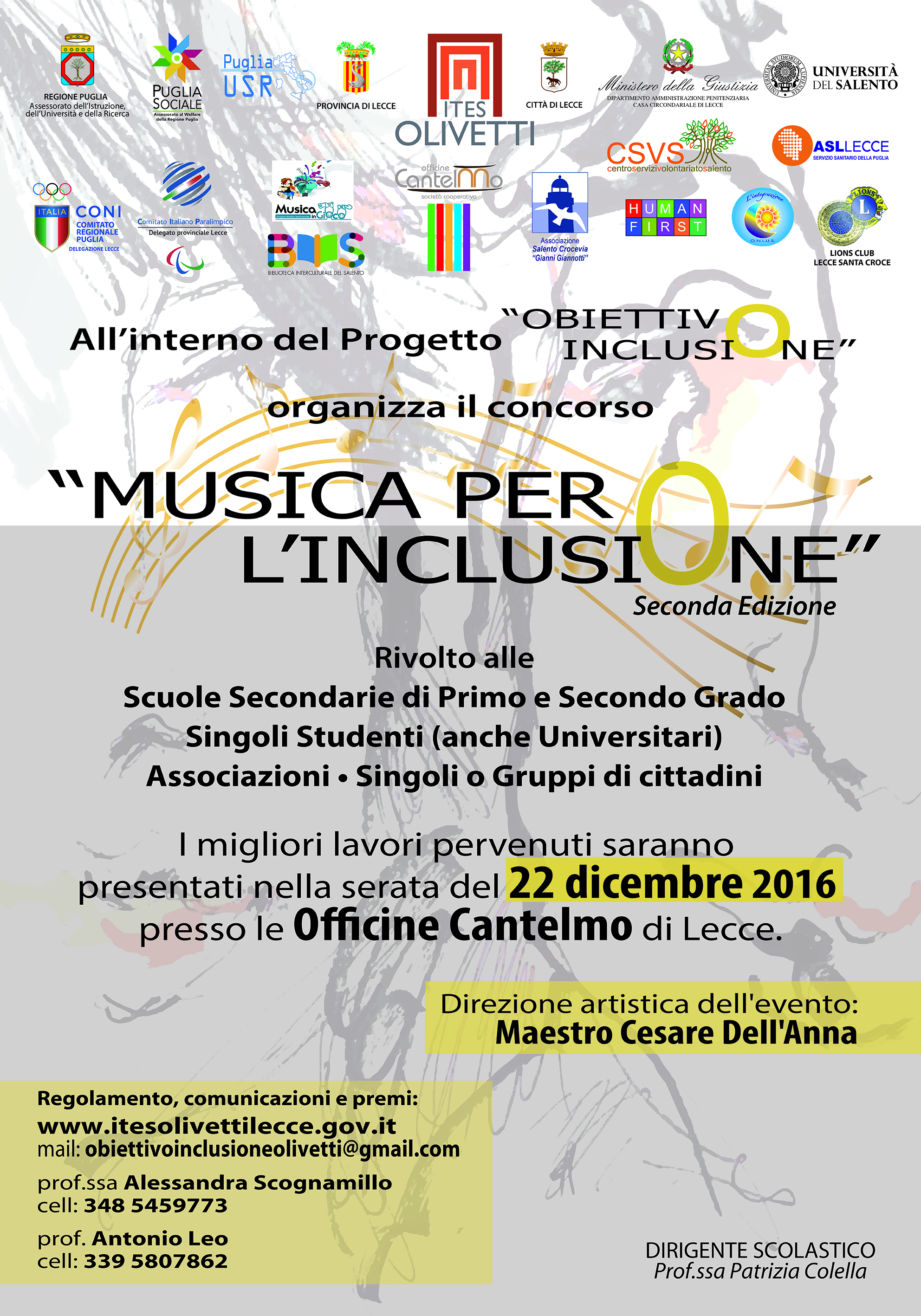 Per il secondo anno all’interno del progetto “OBIETTIVO INCLUSIONE” è indetto il concorso musicale: